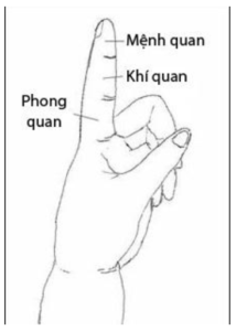 Ngón trỏ lạc mạch phần hiển hiện có thể phân làm phong, khí, mệnh, tam quan. Đốt thứ nhất là phong quan tức là từ khớp bàn ngón trỏ (nếp nhăn) hướng lên đến đường chỉ ngang đốt hai. Đốt thứ 2 là khí quan từ đường chỉ đốt 1 – 2 đến đường chỉ ngang đốt 2 – 3. Đốt thứ 3 là mệnh quan, đường chỉ thứ 3 lên đến đầu ngón trỏ.
